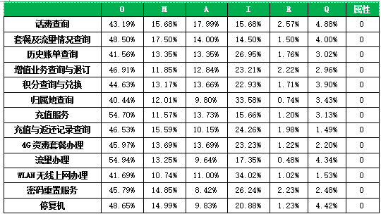 l 充值服务、流量办理、套餐及流量情况查询、话费查询、停复机为排名前五的因素,对于客户的满意因素敏感性较强,需重点关注提升;