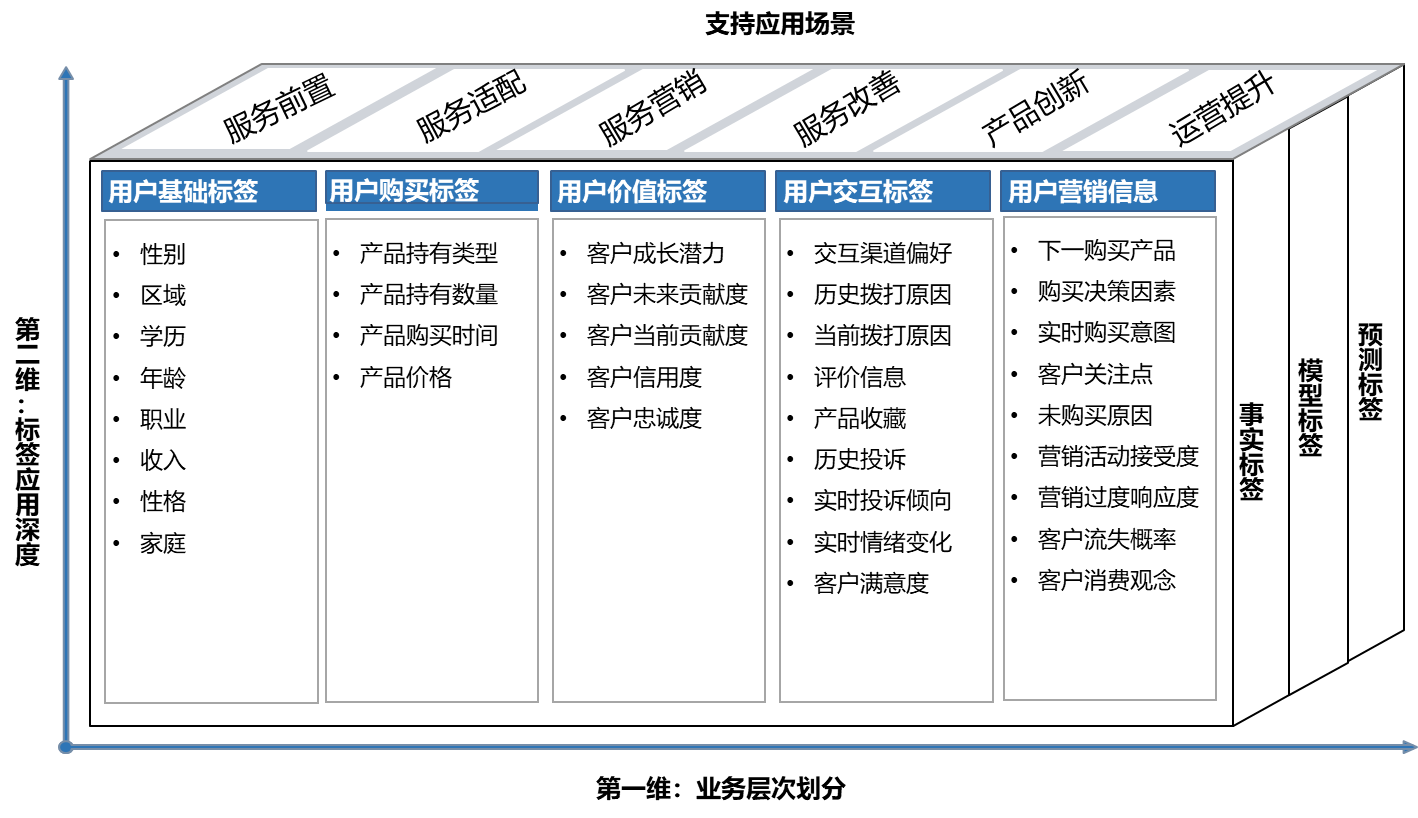 在客户标签体系的基础上,按照应用场景,形成“千人千面”的客户画像,并将客户画像与生产系统关联,辅助人员对来话进行预判及精准营销与服务,进而支撑一线的精准营销及服务。