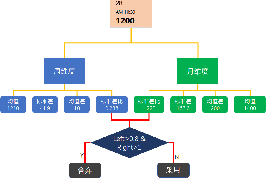 从图2中可以发现,一个数据在周和月维度上的同系列值形成周和月的平均值、标准差,并依照与平均值的差形成的标准差倍数作为这个数据是否该被清洗掉的判断依据。在图2中,这个数据在周维度上落在允许的波动范围内,而在月维度上超过了1个标准差的上限。若采用苛刻的OR规则,两个标准差中有一个超过上限,这个数据就会被清洗掉;在图2中,是采用了宽容的AND规则,则只有在两个维度上都超过标准差倍数上限,这个数据才会被清洗掉。