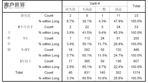 我们使用SPSS进行交叉分析后,得到了不同层次的座席代表满意度数据,例如: