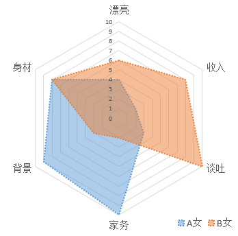 第三,将你的目标对象在A女在六个维度上打分。如:A女,漂亮4分,收入2分,谈吐3分,家务10分,背景情况9分,身材8分。将六个点顺次连线。B女也按同样的方式进行打分,你就得到图2这张雷达图。