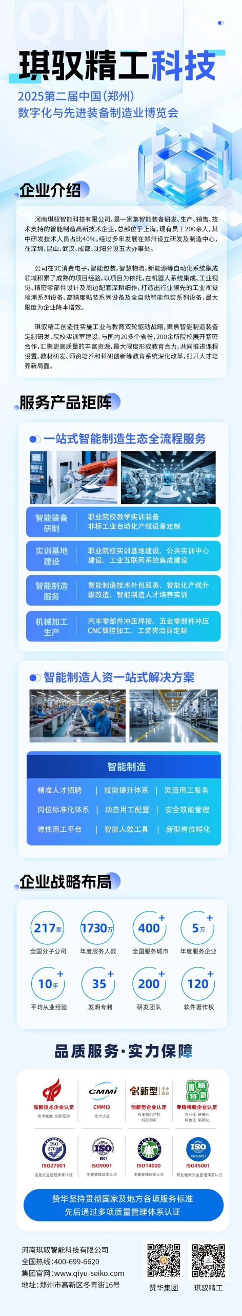 赞华集团旗下子公司——河南琪驭智能科技有限公司(以下简称“琪驭智能科技”)将携全矩阵产品与解决方案亮相,诚邀您莅临交流,共探智能制造的未来路径,共享数字化转型的时代机遇。