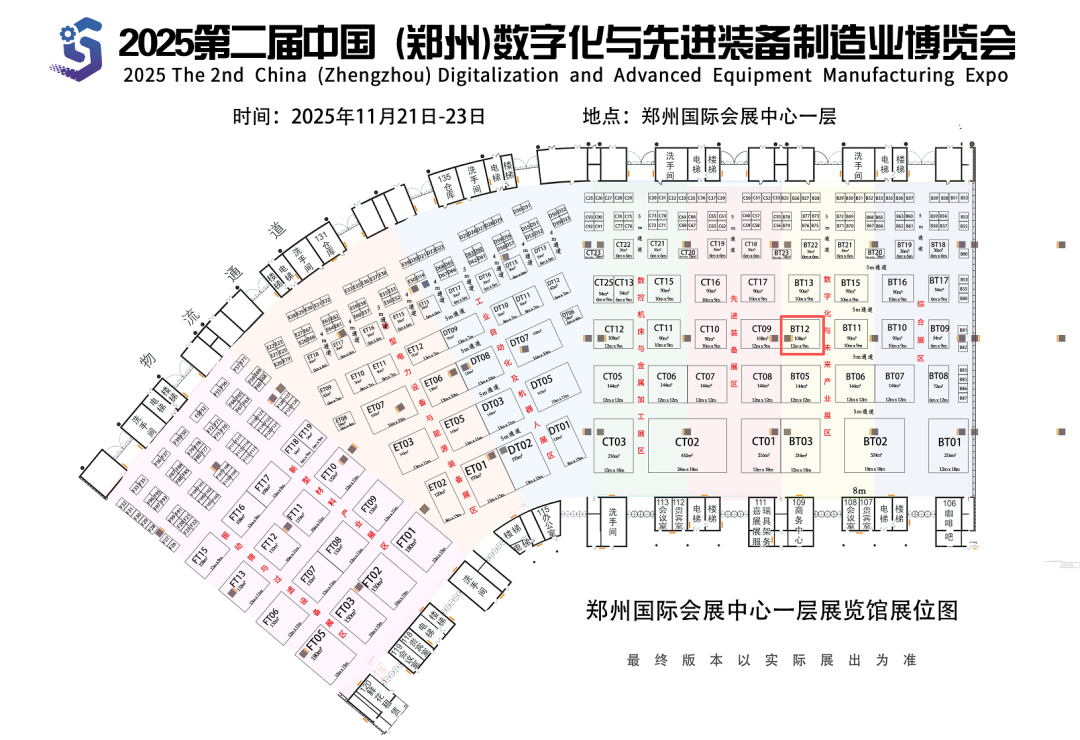 展会规模进一步扩大,展览面积达33,000平方米,预计吸引600家企业参展、50,000名专业观众参与。现场设有八大展区,包括综合展区、数字化与未来产业展区、先进装备展区、数控机床与金属加工展区、工业自动化及机器人展区、新型电力设备与能源装备展区、新型材料产业展区以及振动筛与过滤设备展区。