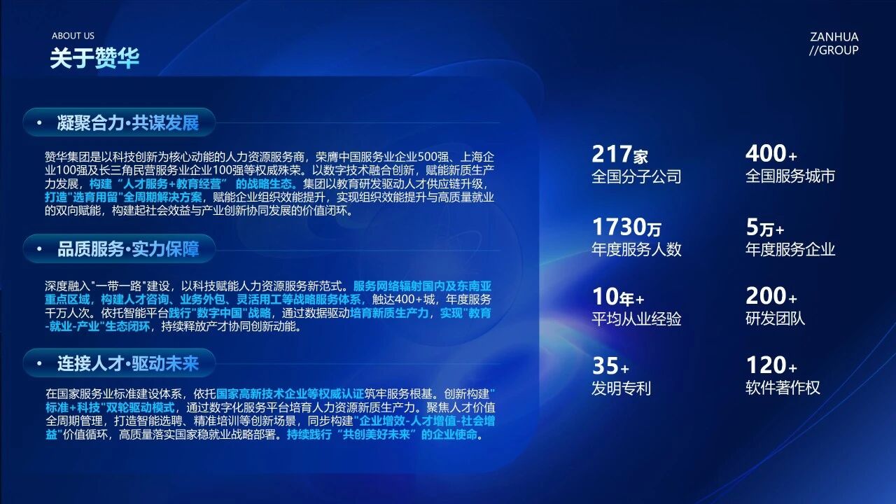 作为人力资源服务领域的领先企业,赞华集团积极响应国家号召,以上海人力资源服务企业代表的身份,精彩亮相大会上海展区(展位:2A17-3),系统展示了集团以“人才服务+教育经营”双轮驱动的生态化战略与创新成果。