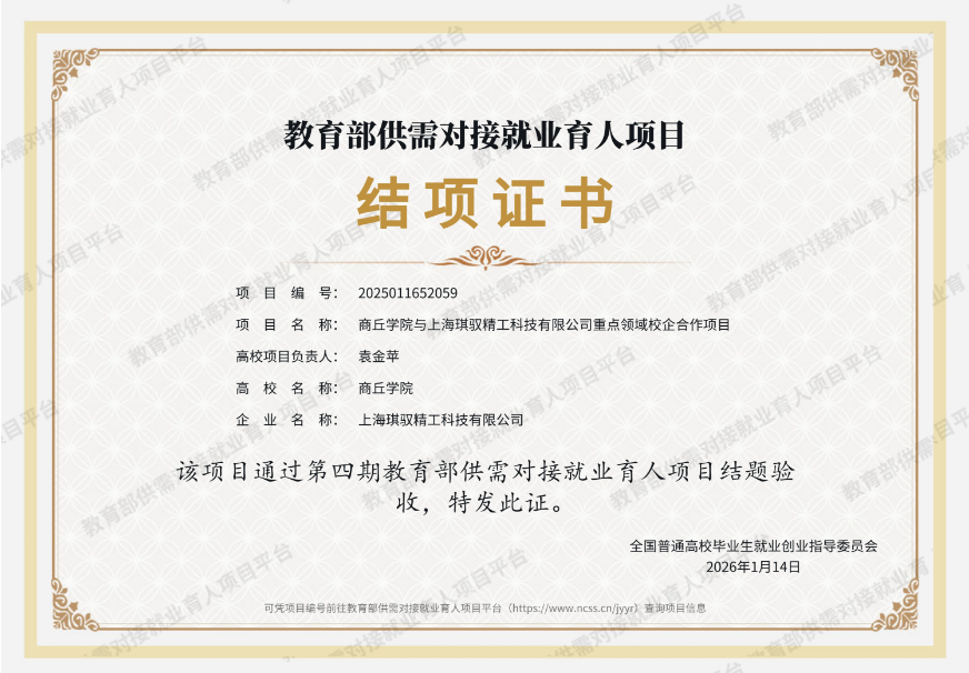 近日,由上海琪驭精工科技有限公司与商丘学院联合申报并实施的第四期教育部“供需对接就业育人项目”顺利通过结题验收,并正式获得结项证书。该项目聚焦高端制造领域人才培养,是双方深化产教融合、推动教育链与产业链有机衔接的重要成果。