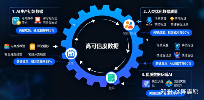 这里的关键是:AI 生成初始数据,人类优化数据质量,再用优质数据训练 AI—— 形成 “数据生产 – 优化 – 再生产” 的闭环,让数据越来越可靠。