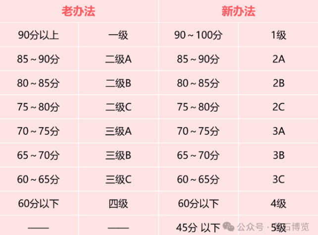 关于评价等级。总体上来看,新办法中除了从四级中拆分出了5级(45分以下)外,其他等级所对应的得分与老办法相比,没有明显的变化。