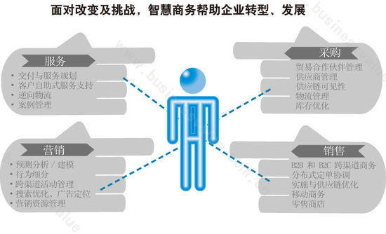 智慧商务并不是单纯的电子商务,而是包括电子商务,同时还涵盖了传统商业运营的所有商务模式——帮助企业在社交网络、移动计算和在线购买的时代,更有效地开展市场营销、销售产品并提高客户忠诚度。