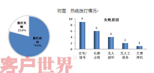 在207条热线中,83条热线拨打成功,成功率为79.0%;22条热线未能打通,占被测评热线数量的21.0%。未打通的热线,打不通的原因各不相同。其中,9条热线显示为空号或错号;6条热线长期占线,无法接通;4条热线无人接听;2条热线没有人工服务;另有1条已欠费停机。