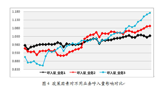 这需要数据分析人员有着高度的商业敏感性,能敏锐地感知在历史和当前运营情况下未来可能发生的决策变化以及未来决策的影响模式、影响大小、影响时间、影响范围。从下图(如图4)可以看出,业务1相对于业务2、3来讲更显平滑,这是因为最近三年来业务1呼入量的增长主要受到是客户量和交易量的增长影响,而业务2、3在近三年的运营中受到高层政策、业务系统、运营模式的影响非常显著。