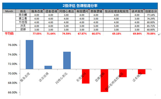 下表是笔者通过培训后的QA反馈,跟踪技能培训后,学员的技能提高情况。基于这样的三级行为跟进,可以宏观地观察培训对员工服务技能的改善情况。总体应该是正向的。但你也会有趣地发现,有些学员二级评估很高,但是培训后的技能没有提高,反而退步了。这说明员工在呼叫中心的服务行为表现是一个系统的结果,或许是管理、或许是团队氛围、甚至是激励促使,培训只是服务技能优化的催化剂。