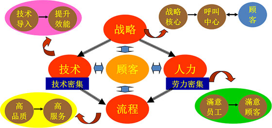 从下图呼叫中心涉及的方方面面可以看出,呼叫中心既是劳力密集型(又称智慧密集型),也是技术密集型的地方。技术的使用协助了效率的提升,提升了服务的速度;满意的员工提供了高质量的服务,带来了满意的客户;战略的高度决定了对顾客的服务宗旨;流程的完善体现着对顾客的服务品质。这些因素的结合,直接带来的是服务质量和速度的提升,顾客满意度的提升,最终导致的是成本的下降以及呼叫中心收入的提升。