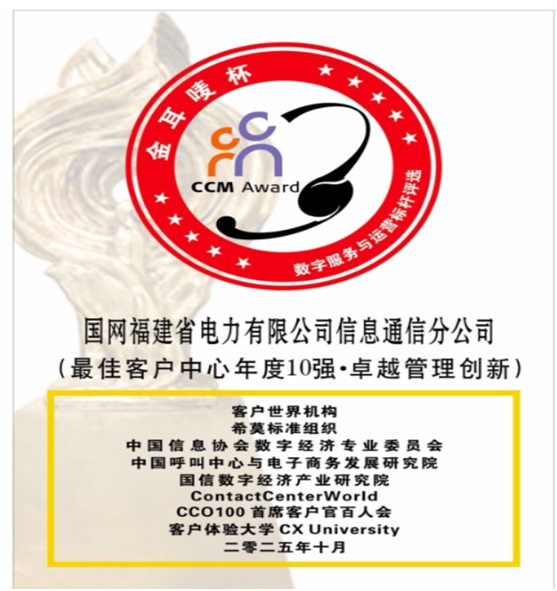 国网福建省电力有限公司信息通信分公司荣获2025“金耳唛杯”数字服务与运营标杆评选-最佳客户中心年度10强