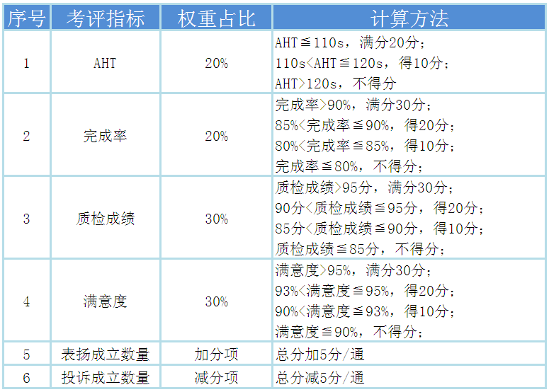 指标选取方面,最直观、有效的方法就是选取客服中心KPI关键指标进行动态监测。这里选取AHT、完成率、质检成绩、满意度、表扬成立数量、投诉成立数量六项,前两项是效率指标,中间两项是质量指标,后两项为加减分项。各项指标权重和综合评价计算方法如表1。