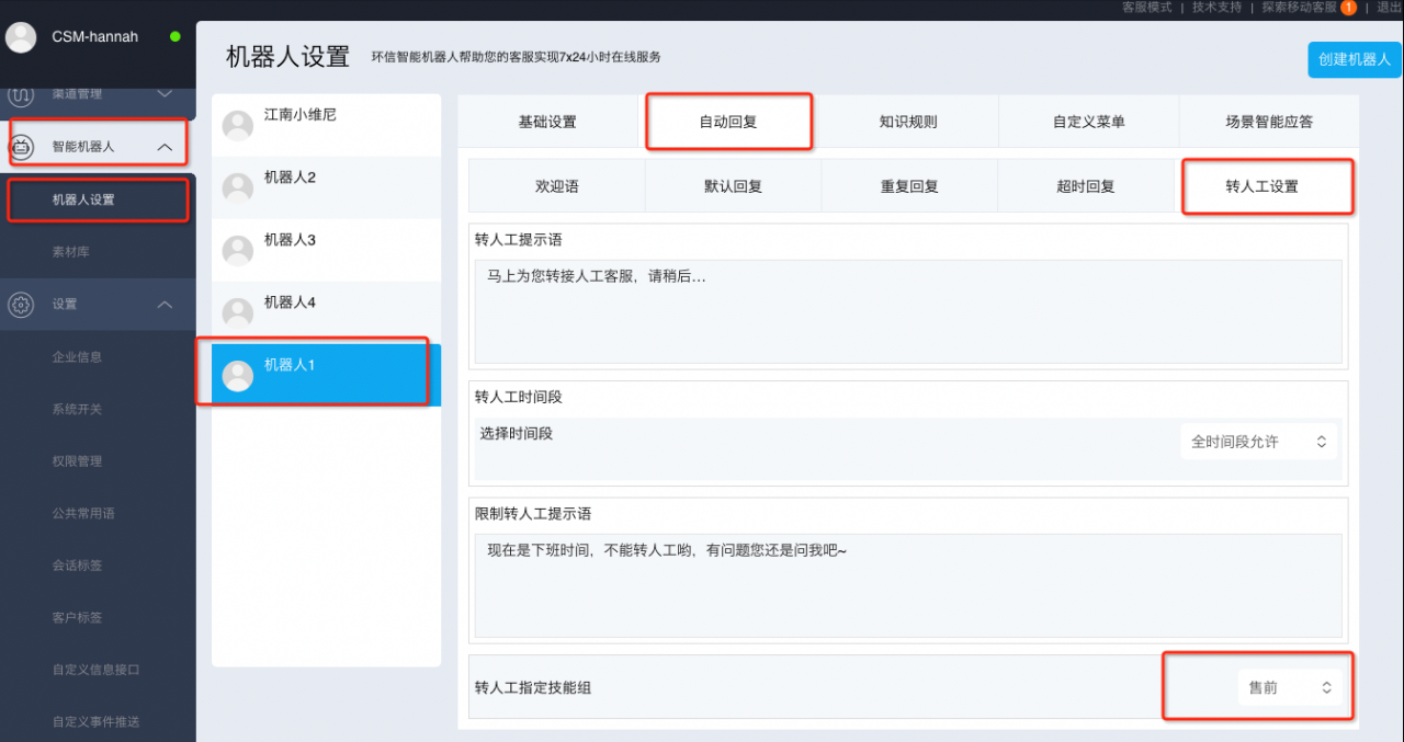 3. 每个机器人的转人工设置对应的技能组: