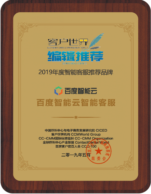 百度智能云智能客服入选《客户世界》编辑推荐: 2019年度“智能客服”推荐品牌榜