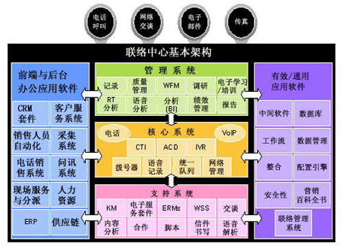联络中心的运作环境从技术上来讲极其复杂,处理一个事务(电话呼叫,电子邮件,Web交谈,IM,传真,视频片断等等)可能需要1到多达50多个不同地点的系统或应用软件。事务处理可以采用多种系统,有些是内建的,有些是托管的,而有些则是外包的。见图1。
