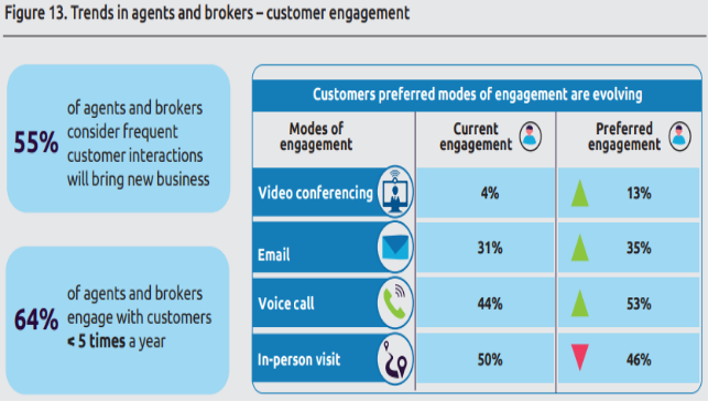 据凯捷咨询(Capgemini)与Efma2021年5月联合发布《World Insurance Report 2021》,保险行业客户接触渠道语音、视频替代线下趋势明显,视频增长225%,语音增长20%,面对面交流下降8%(图1)。