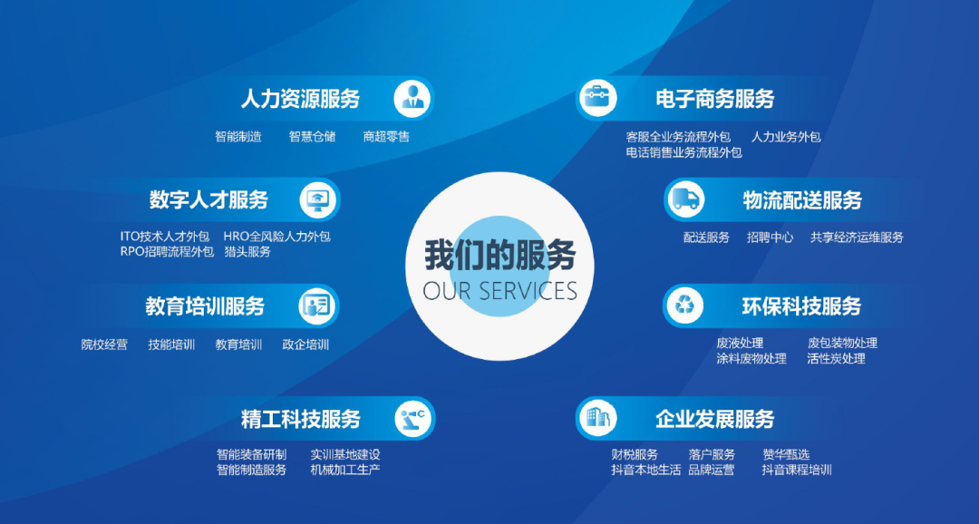 目前集团业务覆盖全国700多城,服务超千万人次。主要提供人才咨询、业务外包与灵活用工等服务,每年为智能制造、互联网电商、汽车制造等重点行业精准输送数万名专业人才,赋能产业升级与高质量发展。服务涵盖人力资源、数字人才、教育培训、精工科技、电子商务、物流配送、环保科技及企业发展。