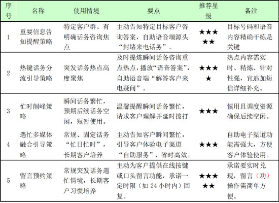 (1)策略内容:突发话务往往导致瞬间话务高峰,如能将瞬间话务“均衡化”,则可有效避免“话务雪崩”,为此通过录制IVR语音,引导客户闲时再拨。【示例】“尊敬的客户,目前人工话务繁忙,为节省您的时间,建议您4小时后再行拨打。给您带来不便,我们深表歉意”。