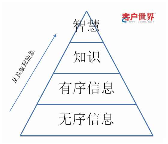 而从更高的层次来看,最低端的是零散数据、散乱文本等无序信息,高一级是经过整理和总结得出的有序信息,再上层是从有序信息经过组织、筛选和沉淀得到的知识,最高层则是需要理解和悟性才能得到的智慧,整个过程是从具象到抽象的层级递进(如图2)。